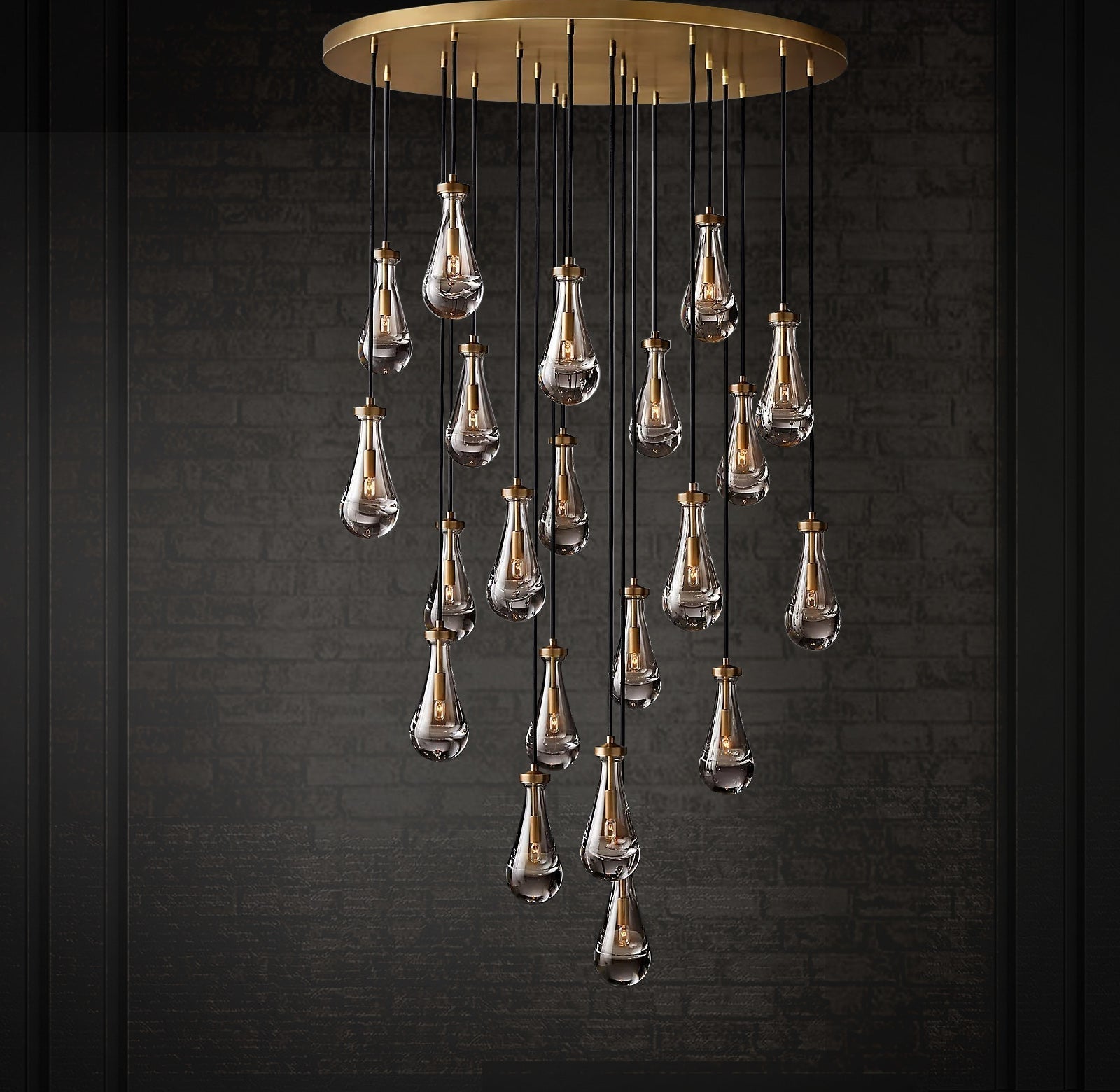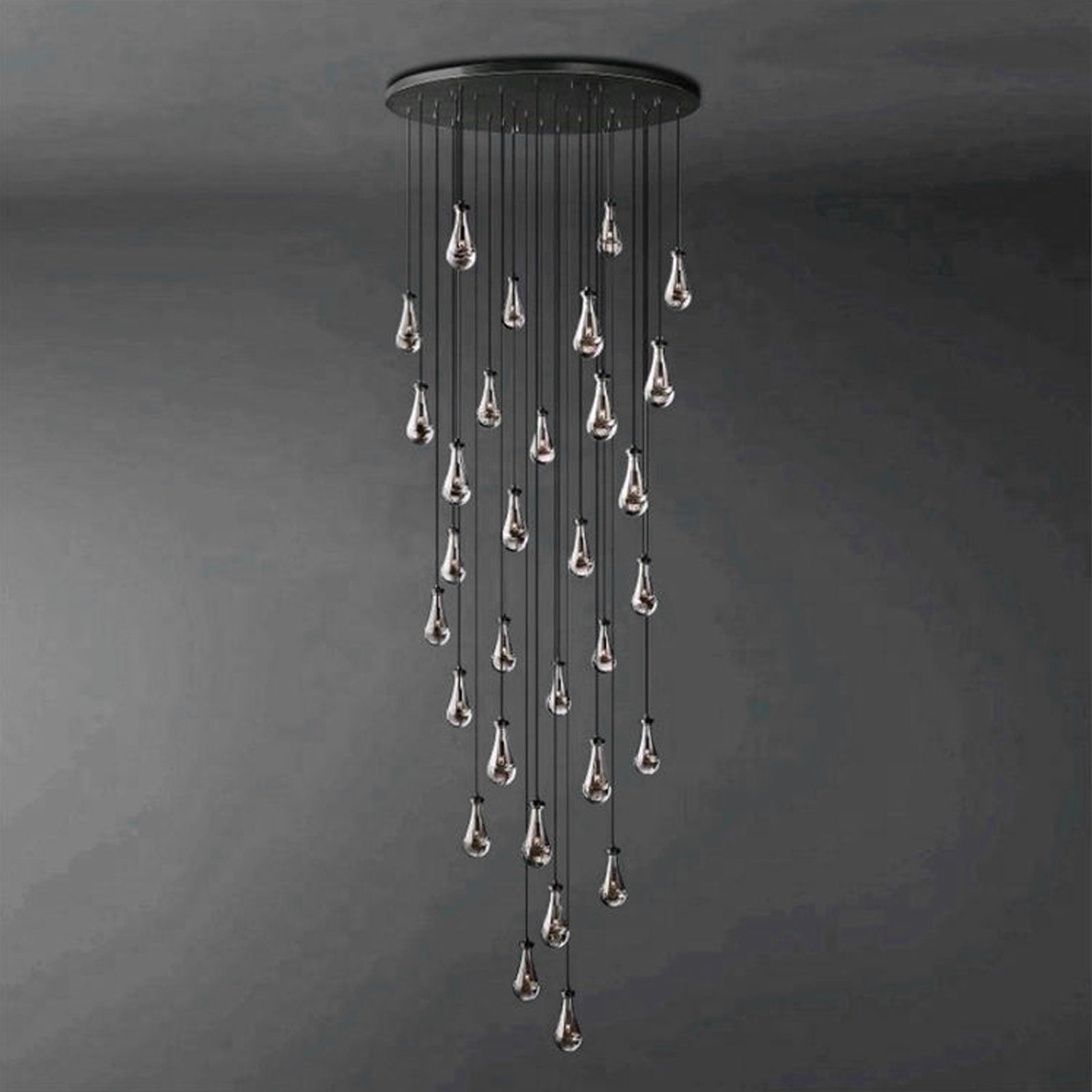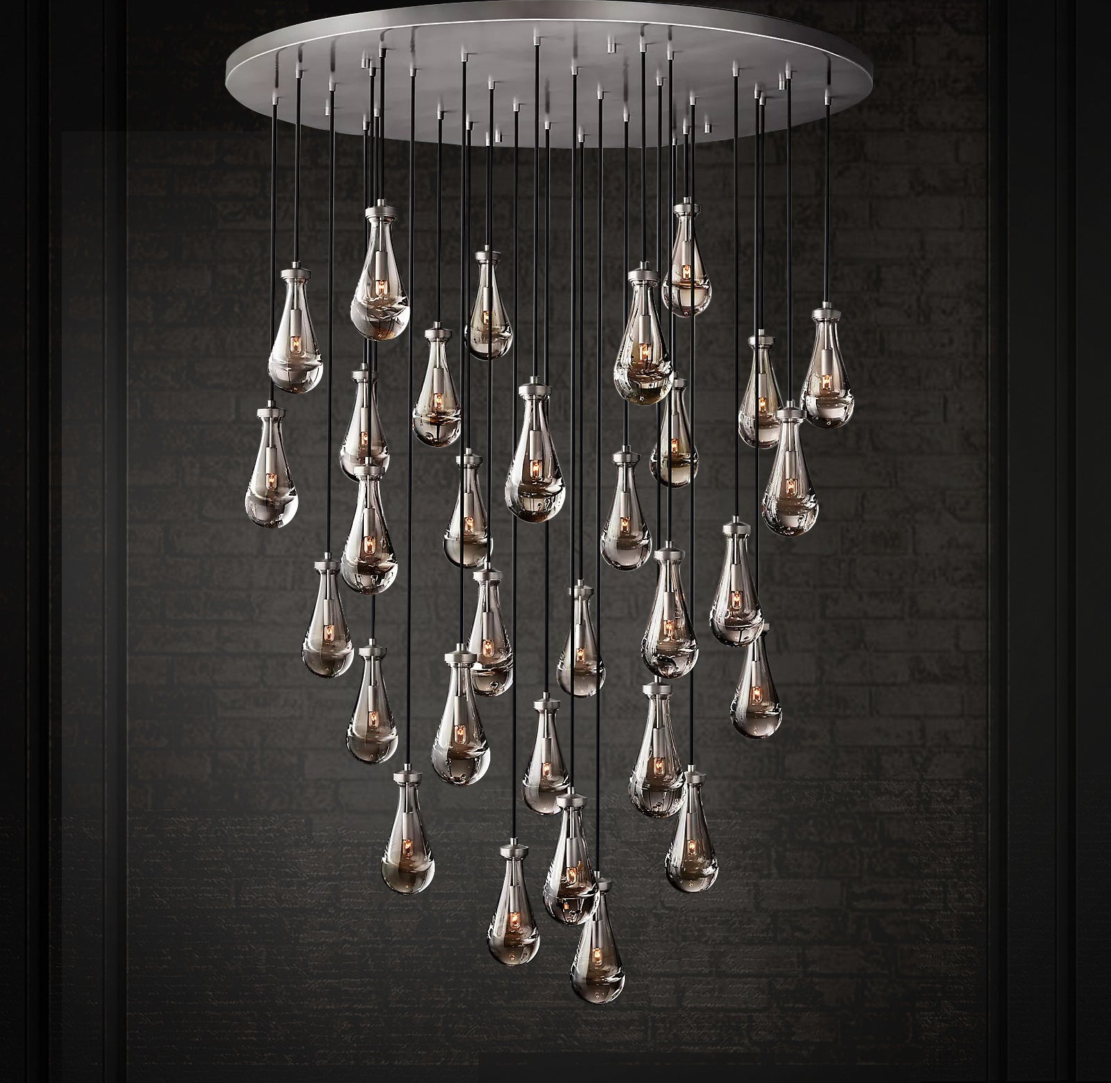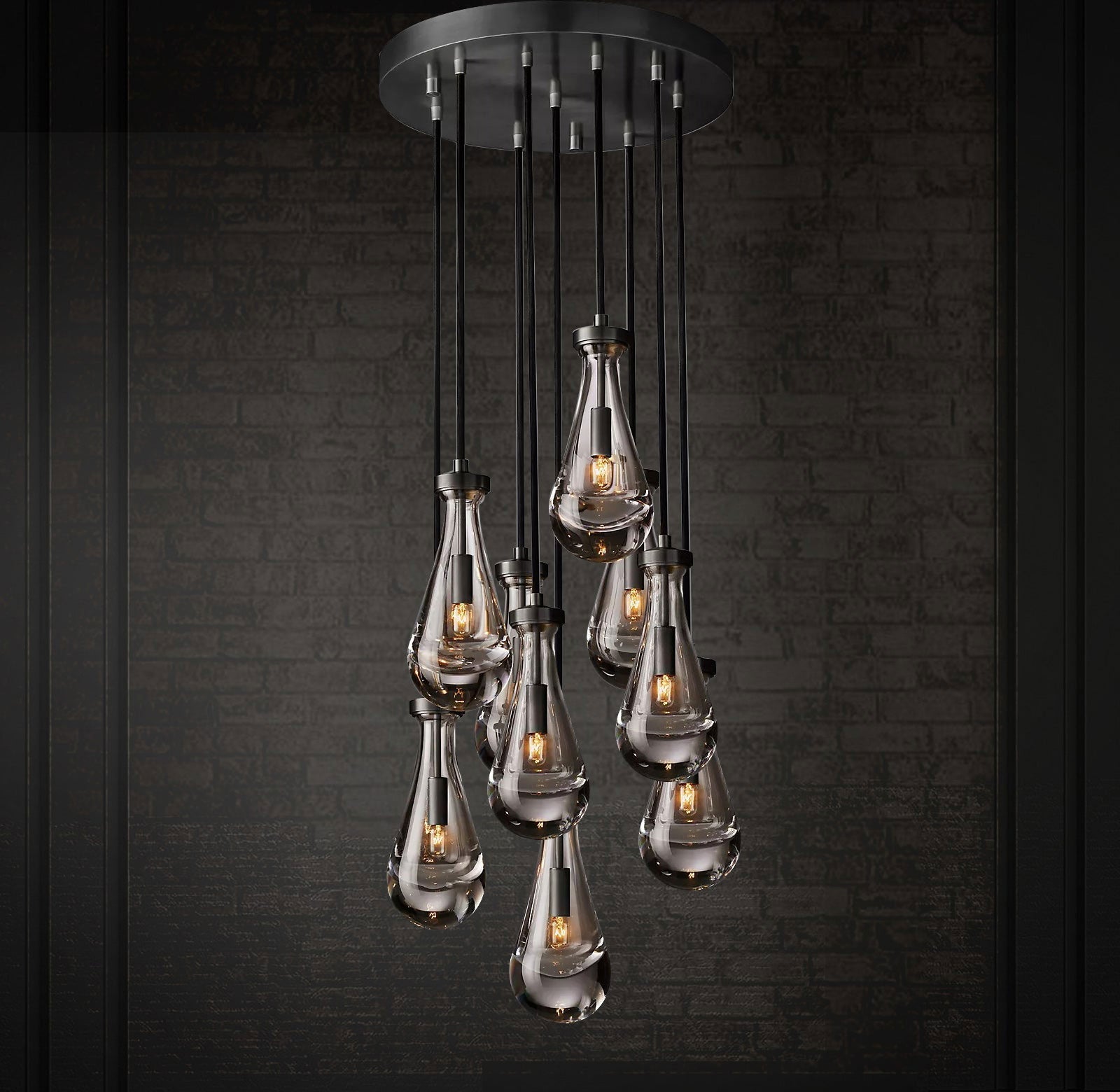 Raindrop Linear Chandelier. Engaging the viewer in an ever-changing pattern of expansion and compression – much like the rhythm of a rainstorm itself. Suspended from slim black cords, drops of blown glass encase the bulbs – creating the illusion of underwater illumination – and cast luminous ripples that wash across ceilings and walls.