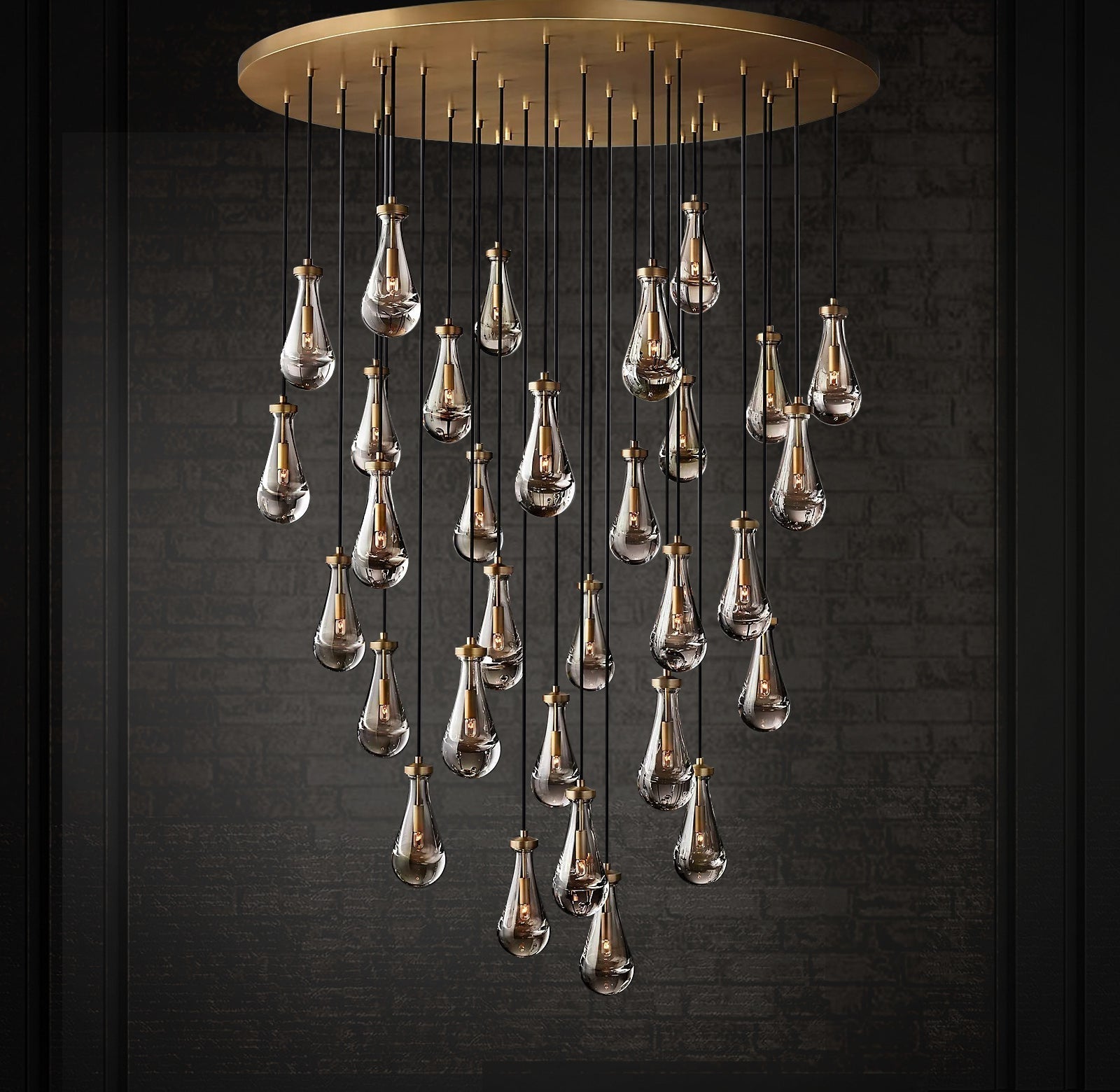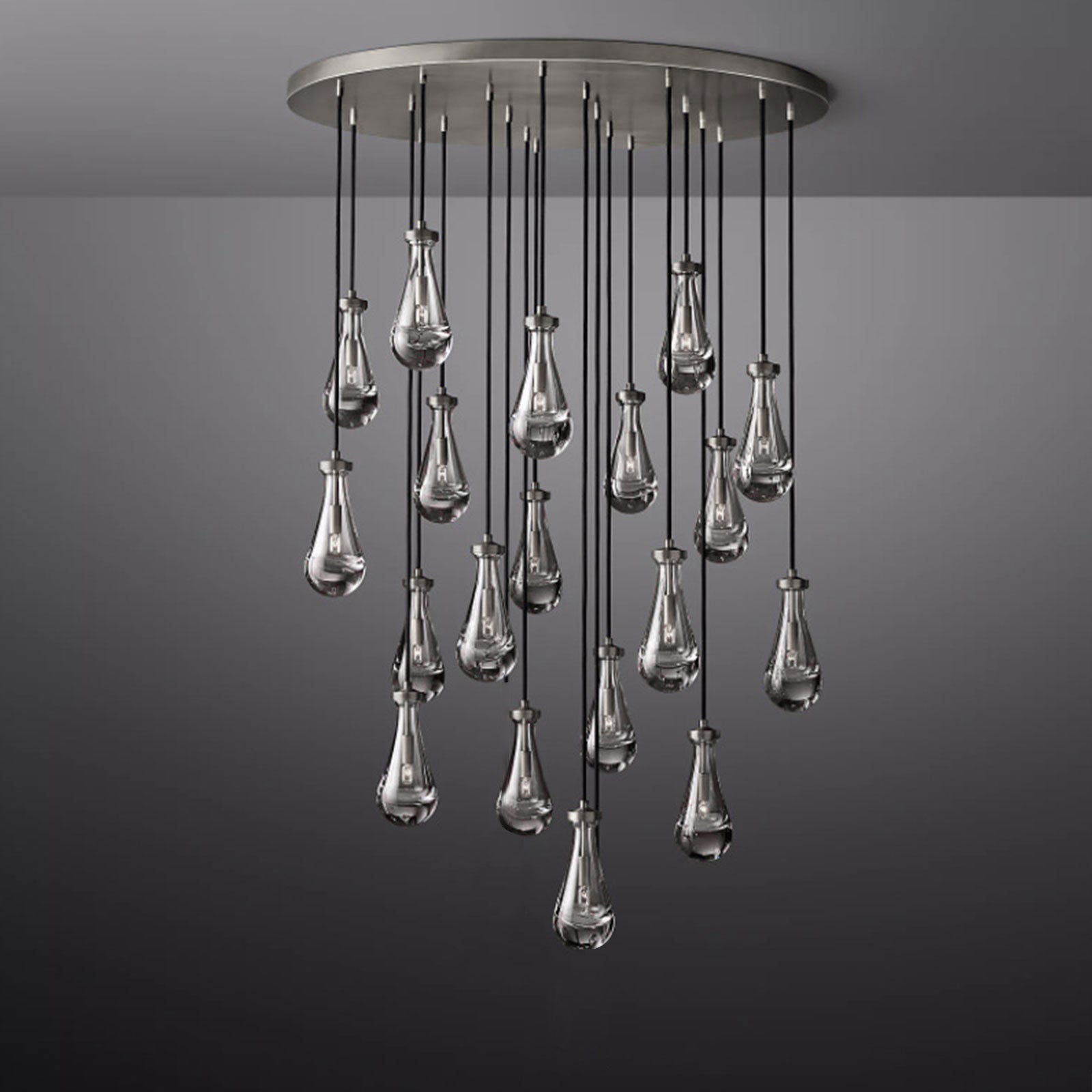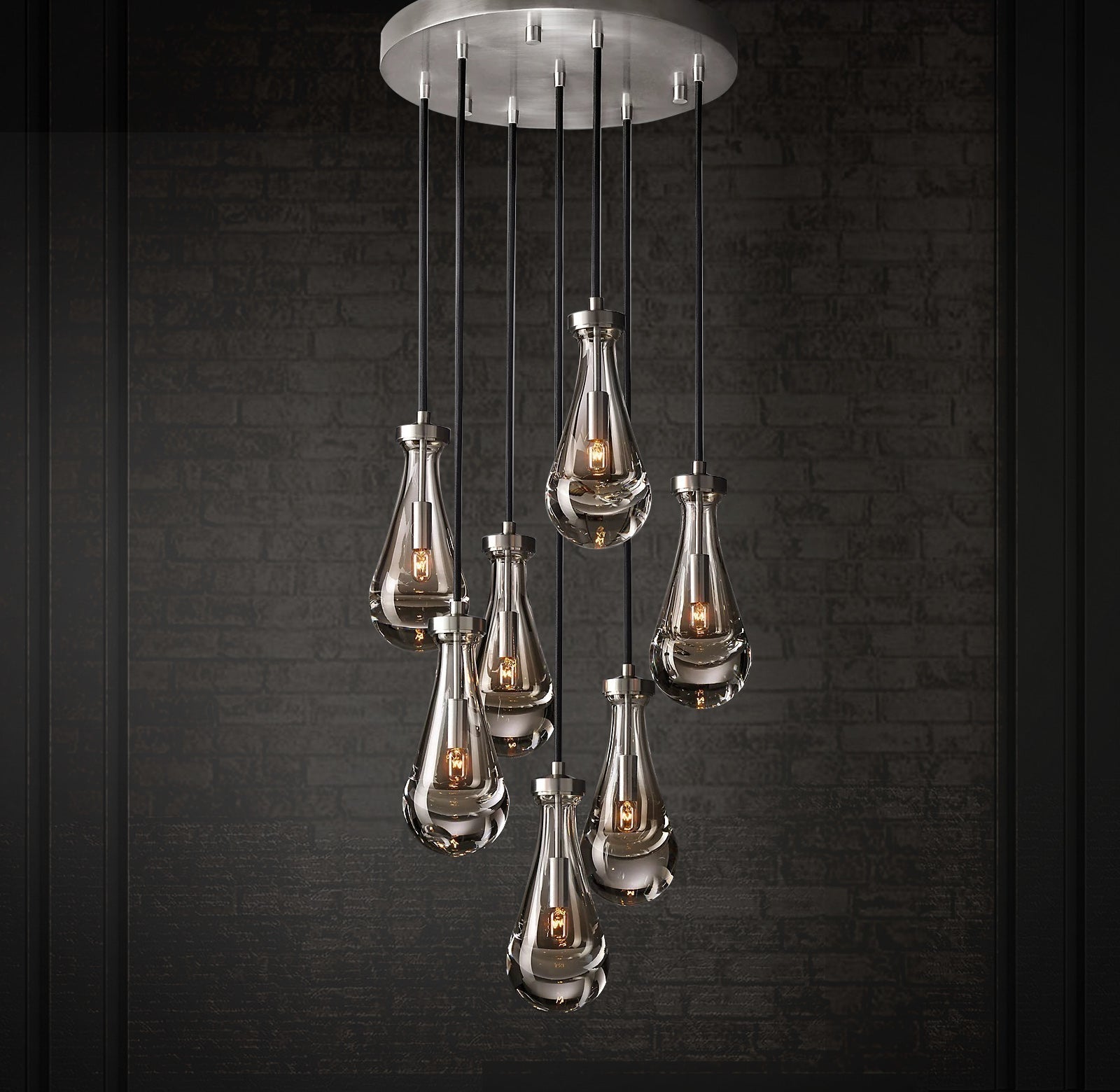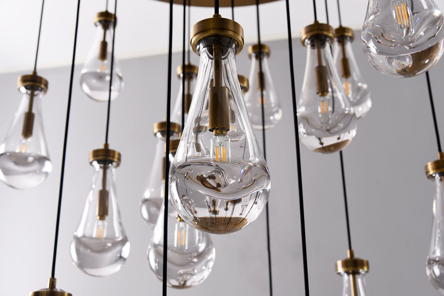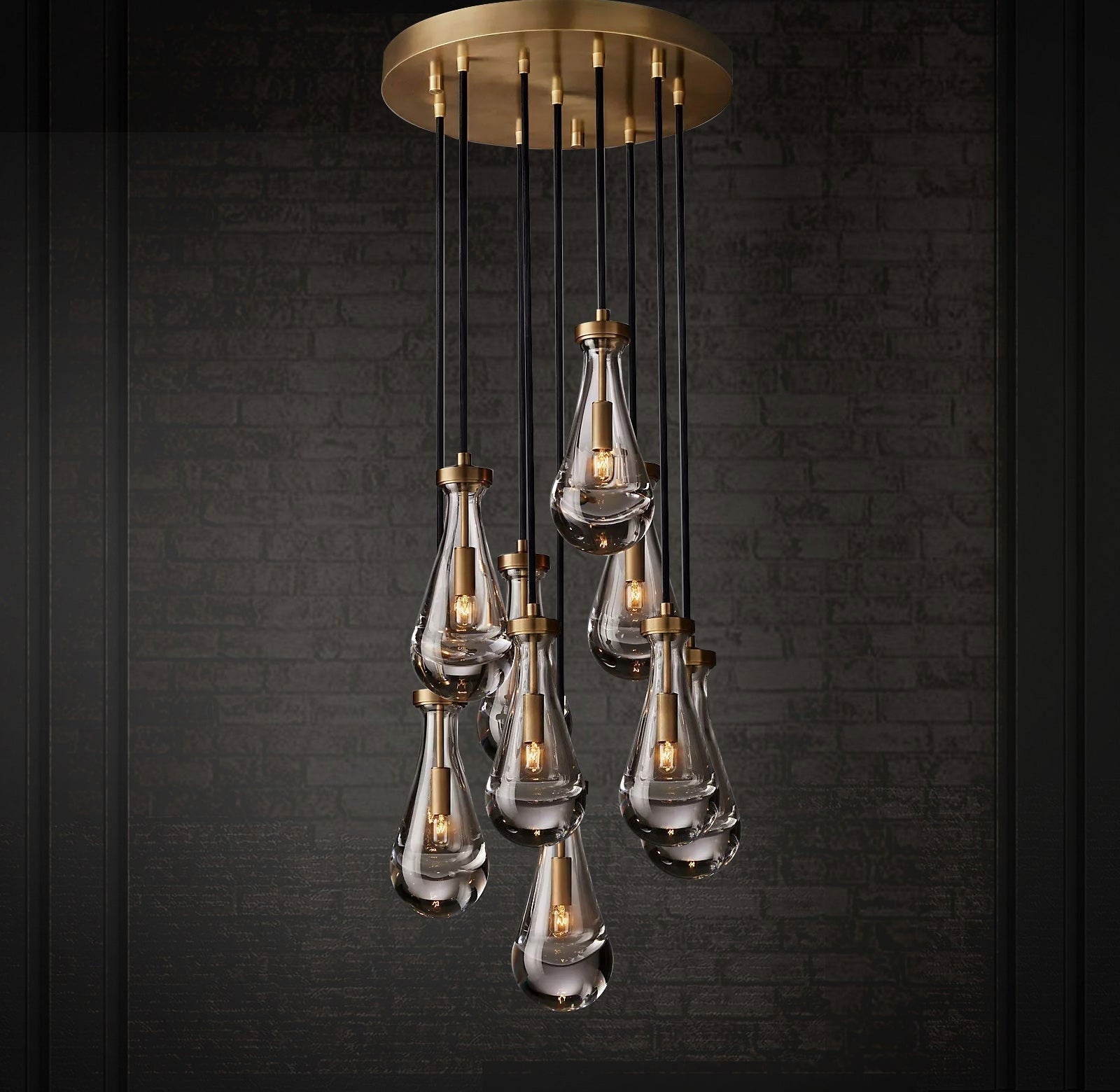 Raindrop Linear Chandelier. Engaging the viewer in an ever-changing pattern of expansion and compression – much like the rhythm of a rainstorm itself. Suspended from slim black cords, drops of blown glass encase the bulbs – creating the illusion of underwater illumination – and cast luminous ripples that wash across ceilings and walls.