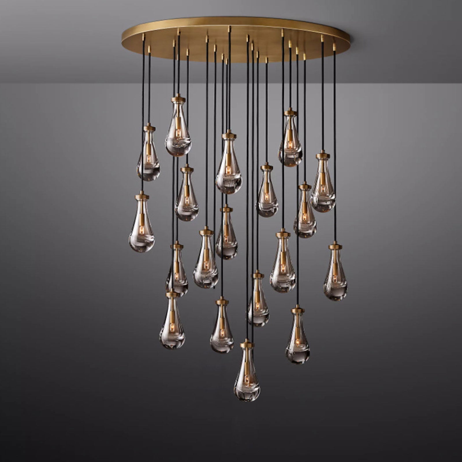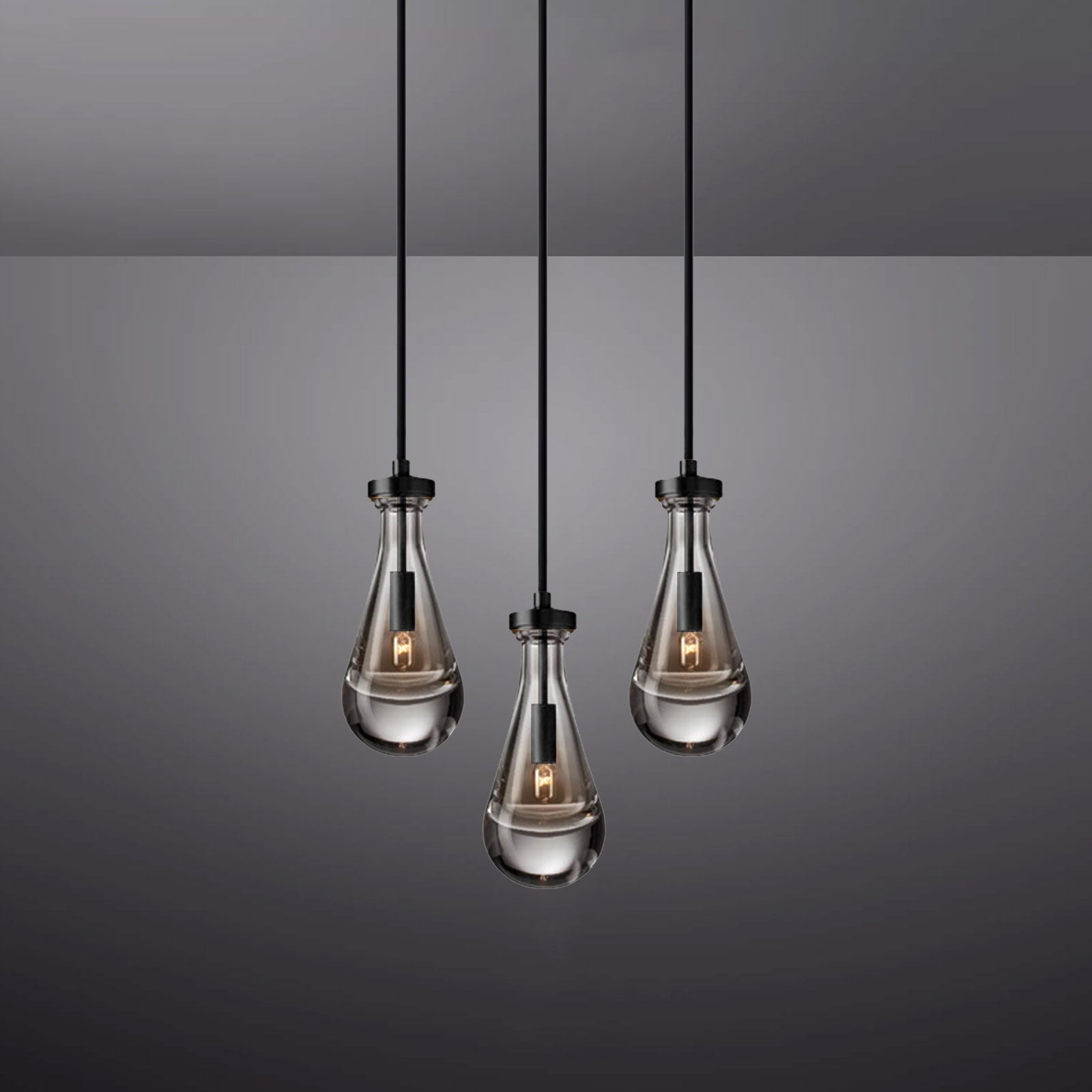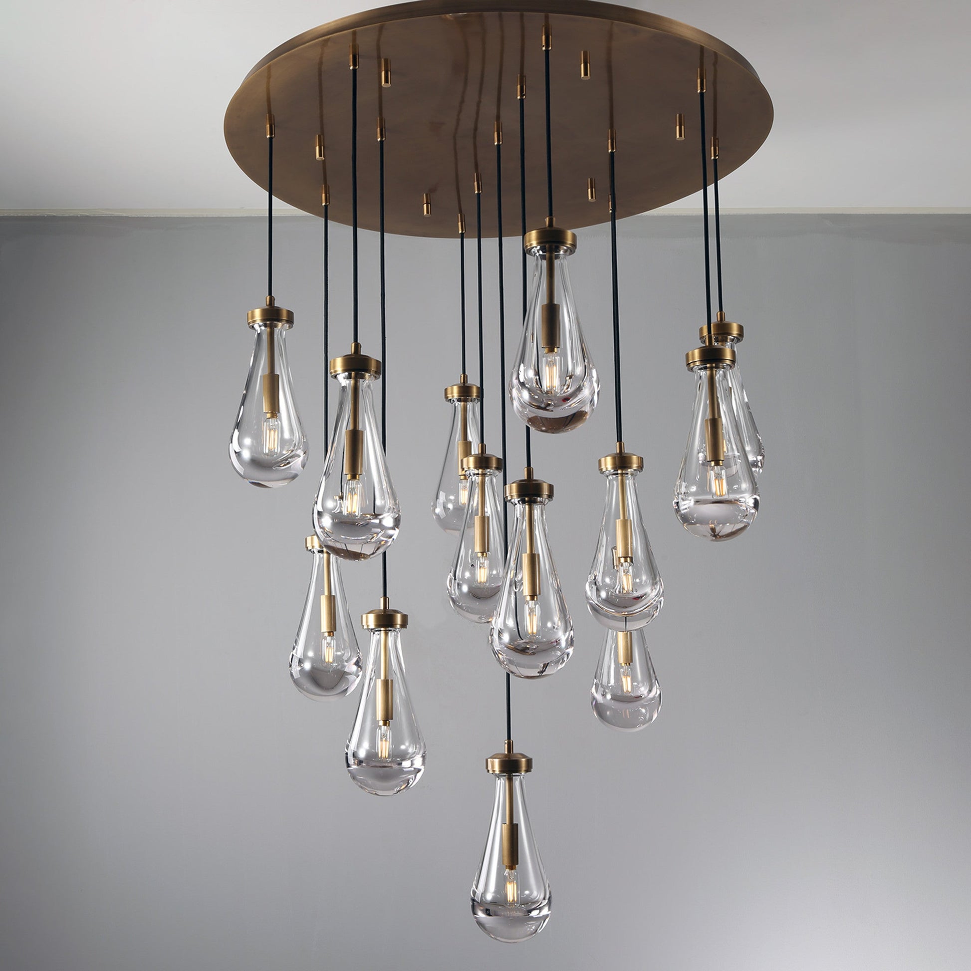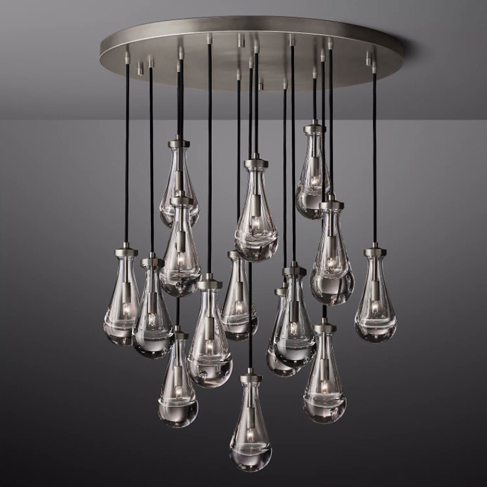 Raindrop Linear Chandelier. Engaging the viewer in an ever-changing pattern of expansion and compression – much like the rhythm of a rainstorm itself. Suspended from slim black cords, drops of blown glass encase the bulbs – creating the illusion of underwater illumination – and cast luminous ripples that wash across ceilings and walls.